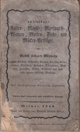 Titel: Der unfehlbare Ratten-, Mäuse-, Maulwurfs-,Wanzen-, Motten-, Flöhe-, und Mücken-Vertilger. Nebst sichern Mitteln gegen Erdflöhe, Schnecken, Raupen, Ameisen, Ohrwürmer, Wespen, Hornissen, Kröten, Erdkrebse und noch viele andere schädliche Geschöpfe - auf dreißigjährige Erfahrung begründet