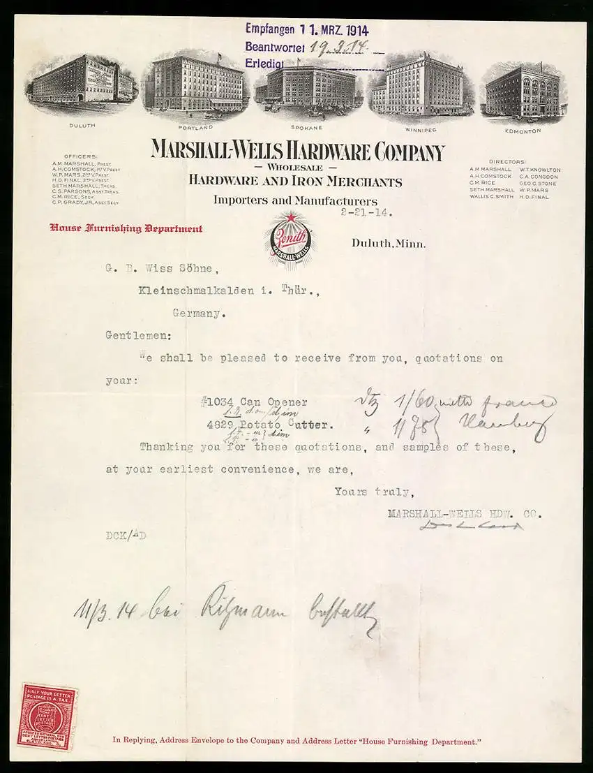 Rechnung Duluth, MN, 1914, Marshall-Wells Hardware Company, Hardware and Iron Merchants, Locations in five cities
