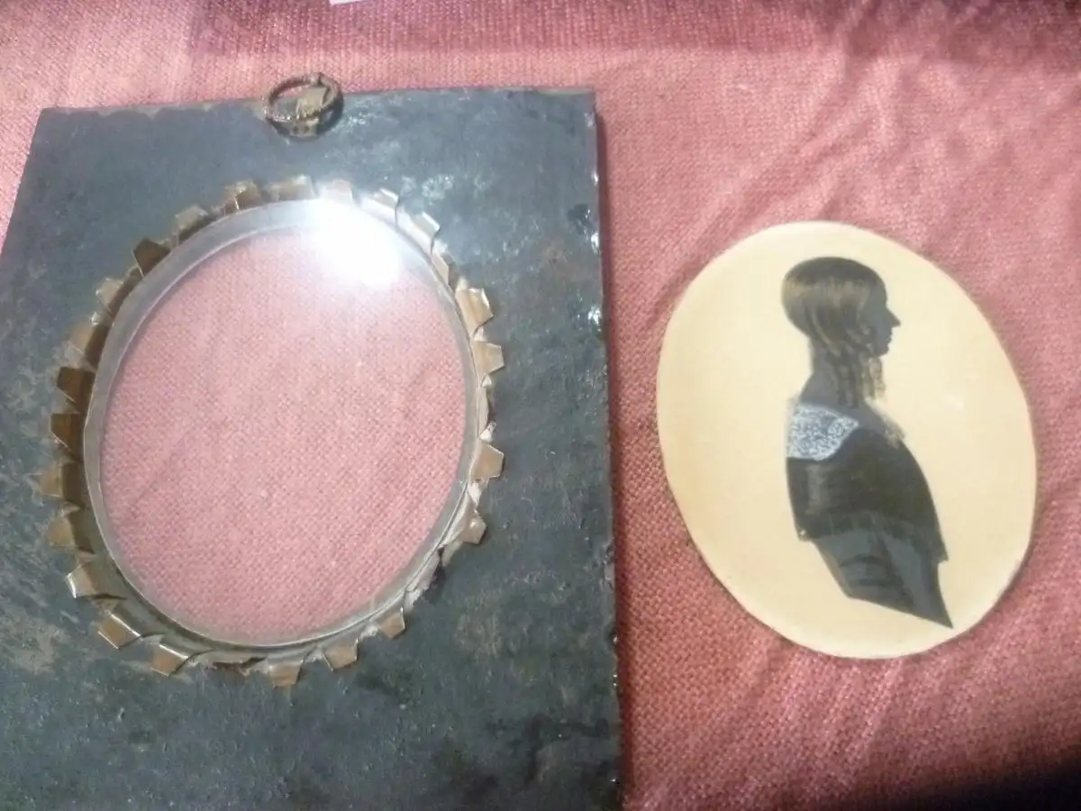 Diese schöne Silhouette ist auf Karton und wurde um 1810- 1830 in England hergestellt. Die Silhouette ist hinter Glas in ihrem originalen Pappmaché-Rahmen untergebracht. Der Rahmen ist komplett mit einem Abschnitt des originalen Trägerpapiers mit der originalen Tinteninschrift „Regency Lady" Zuschreibung Regency Lady" Englische Silhouette um 1810 - 1830 Zuschreibung Field Strang bzw Henry Herve Regency 1800-1837 . Beide Englischer Silhouetten Maler !