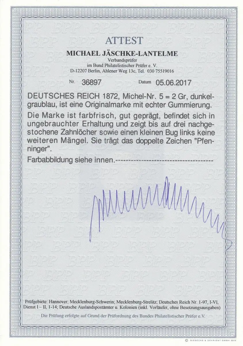 Reich allemand: MiNr. 5, inutilisé, Signature Pfenninger, BPP Attest