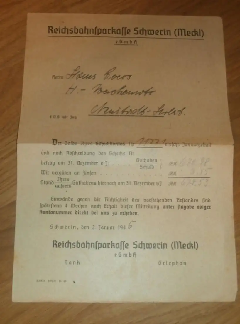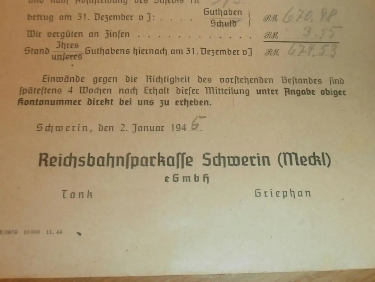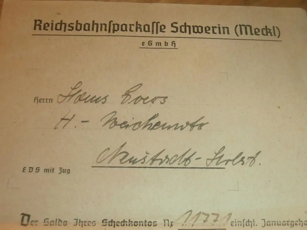 Reichsbahn Sparkasse , 1945 , Weichenwärter Hans Goers Neustadt i. Holstein , altes Dokument , Sparkasse !!!