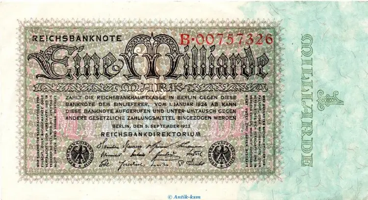 Reichsbanknote über Eine Milliarde Mark von 1923 , Nachkriegszeit und InflationGrabowski / Rosenberg / Pick : DEU-131 a / 111 / 114