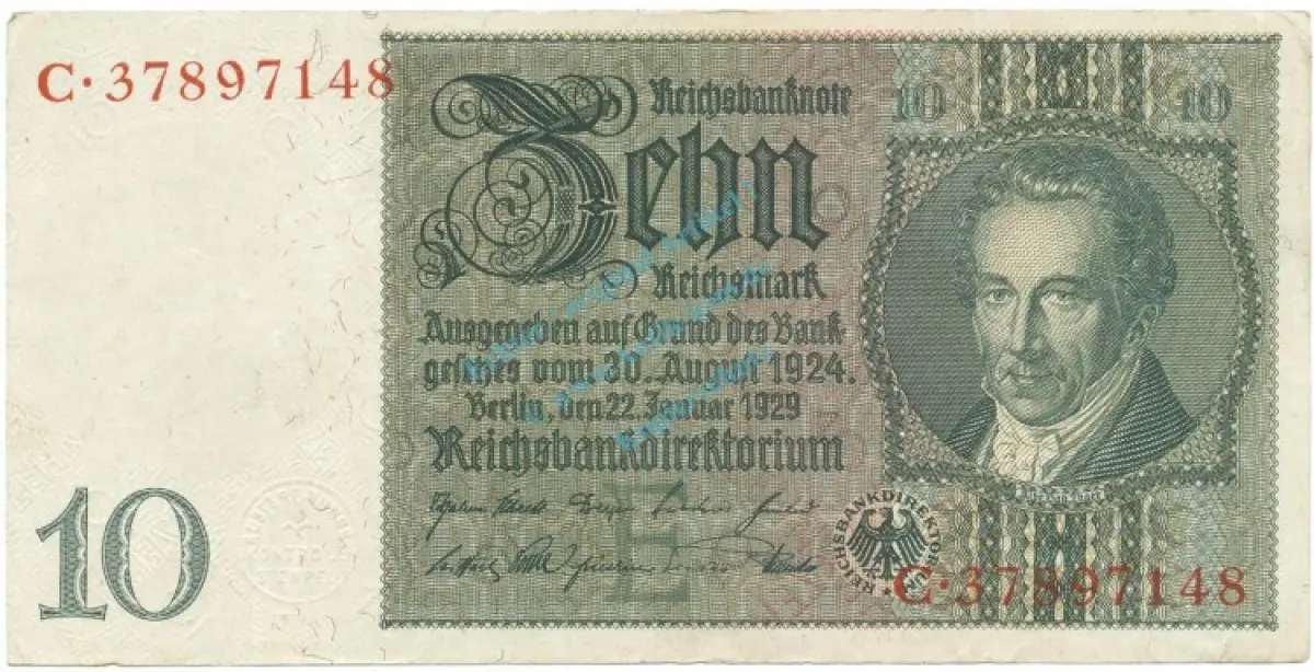 Reichsbanknote , 10 Mark Schein -E 2- L-gbr. DEU-183.b, Ros.173, P.180 Weimarer Republik 1929 Reichsbank