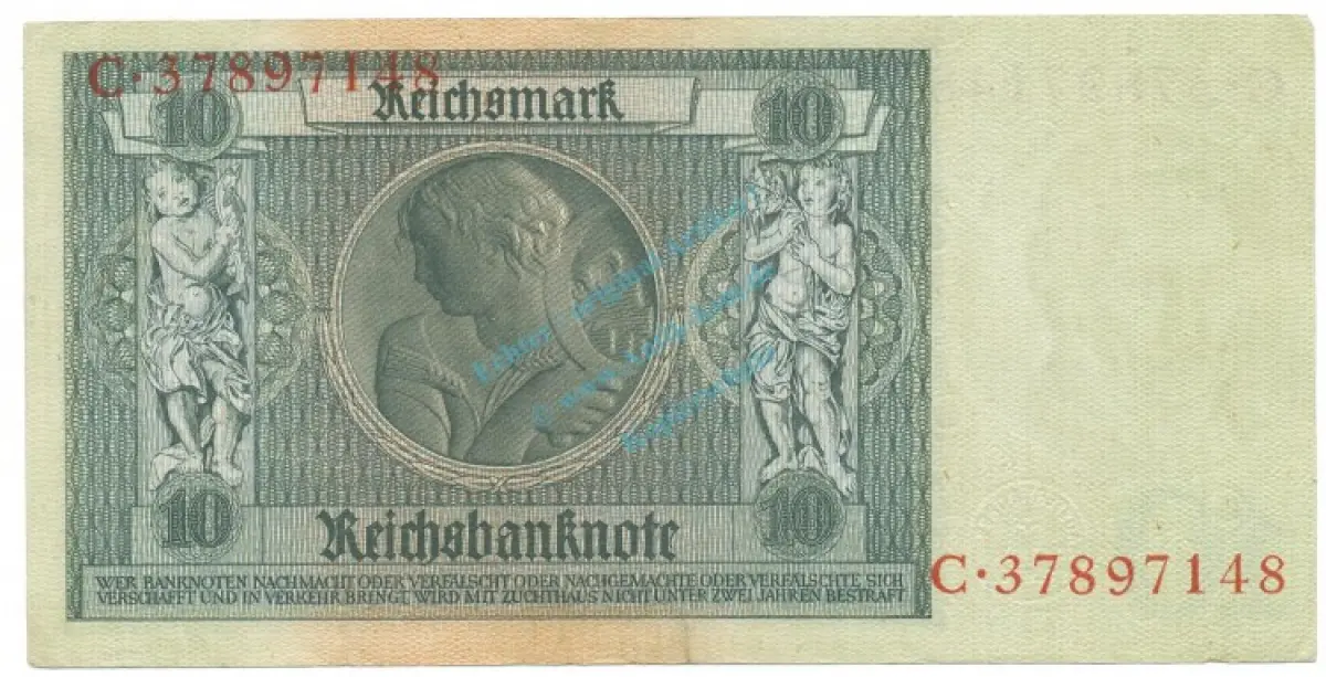 Reichsbanknote , 10 Mark Schein -E 2- L-gbr. DEU-183.b, Ros.173, P.180 Weimarer Republik 1929 ReichsbankUnterdruck Buchstabe = E , Serie = A, B, C, D, E, F
