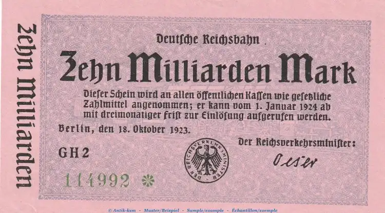 Reichsbanknote über Zehn Milliarden Mark von 1923 , Deutsche Reichsbahn - InflationGrabowski / Rosenberg / Pick : RVM-11.b-h / - - - / S.1021