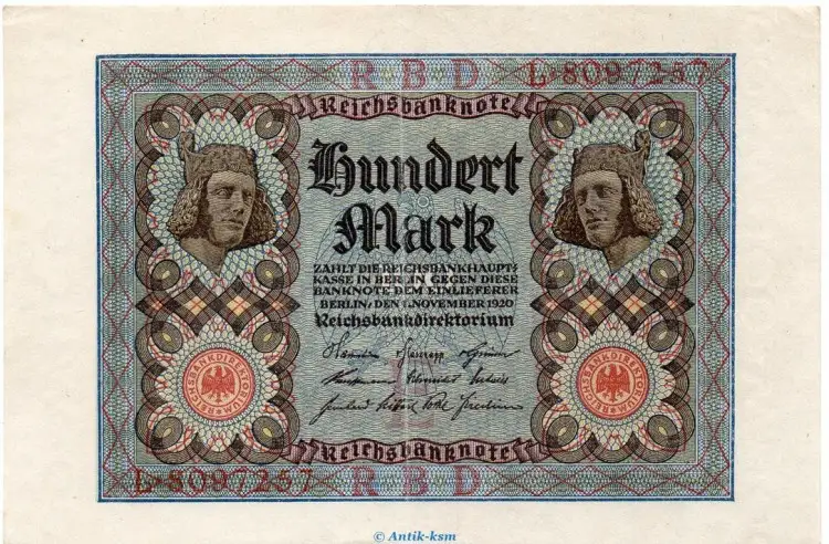 Reichsbanknote , 100 Mark Schein 7-stellig , DEU-75.a, Ros.67, P.69, vom 01.11.1920 , Nachkriegszeit und Inflation