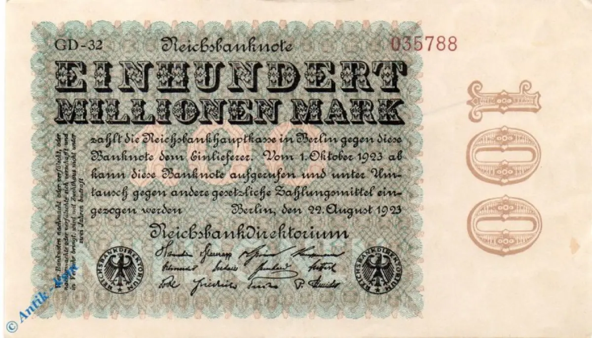 Reichsbanknote über Einhundert Millionen Mark von 1923 , Nachkriegszeit und InflationGrabowski / Rosenberg / Pick : DEU-120 n / 106 / 107