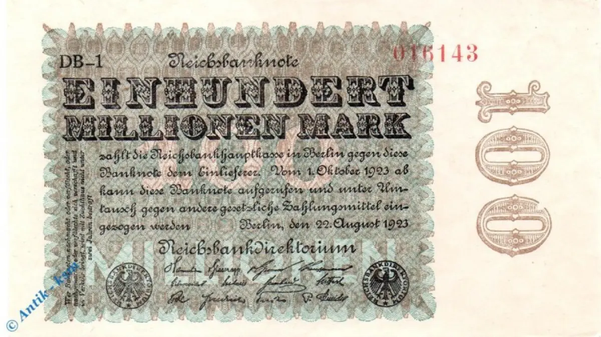 Reichsbanknote über Einhundert Millionen Mark von 1923 , Nachkriegszeit und InflationGrabowski / Rosenberg / Pick : DEU-120 L / 106 / 107