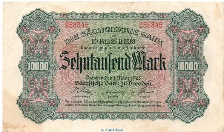 Reichsbanknote über Zehntausend Mark von 1923 , Weimarer Republik - Länderbank SachsenGrabowski / Rosenberg / Pick : SAX-13 / 751 / S.958