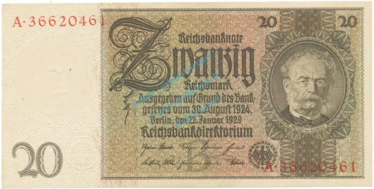 Reichsbanknote , 20 Mark Schein -B 1- in unc-kfr. DEU-184.a, Ros.174, P.181 Weimarer Republik 1929 ReichsbankUnterdruck Buchstabe = B , Serie = A