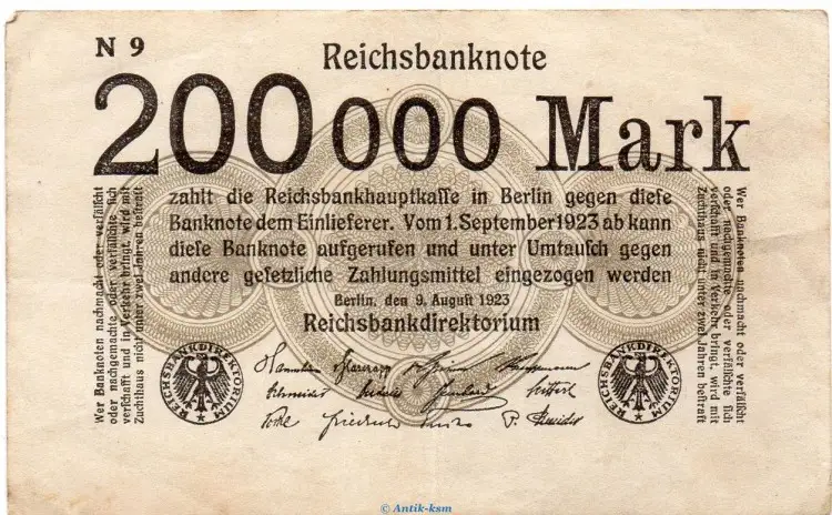 Reichsbanknote , 200.000 Mark Schein in gbr. DEU-111.a , Ros.99, P.100, vom 09.08.1923 , Weimarer Republik
