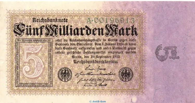 Reichsbanknote über Fünf Milliarden Mark von 1923 , Weimarer Republik - InflationGrabowski / Rosenberg / Pick : DEU-132.a / 112 / 115