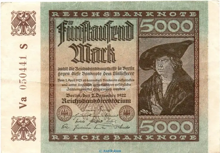 Reichsbanknote über Fünftausend Mark von 1922 , Weimarer Republik - InflationGrabowski / Rosenberg / Pick : DEU-91.e / 80 / 81