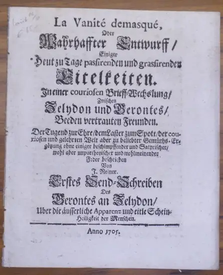 Reiner, J: La Vanite demasque, Oder Wahrhaffter Entwurff / Einiger heut zu Tage passirenden und grassirenden Eitelkeiten. In einer couriosen Brieff-Wechslung / Zwischen Zelydon und Verontes / Beeden vertrauten Freunden. Der Tugend zur Ehre / dem Laster zu