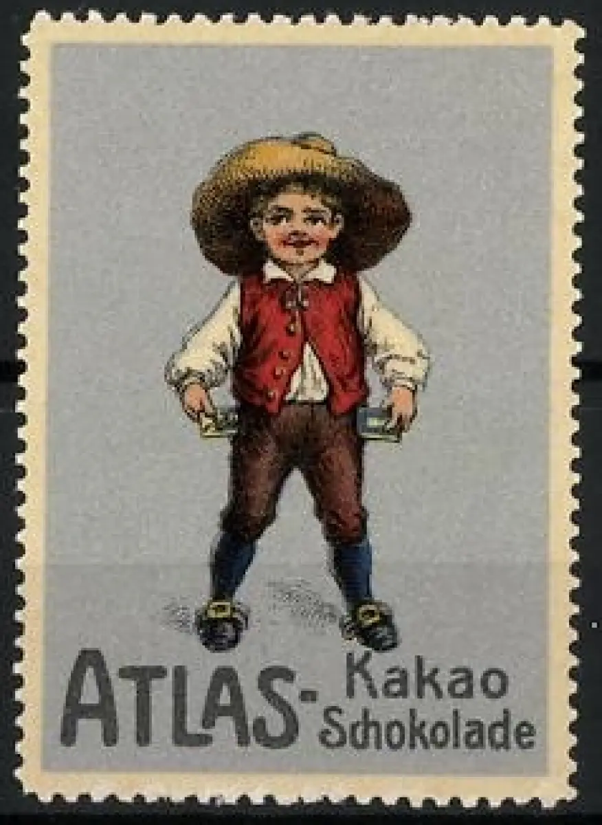 Reklamemarke Atlas Kakao & Schokolade, Knabe mit Hut & Tafeln Schokolade