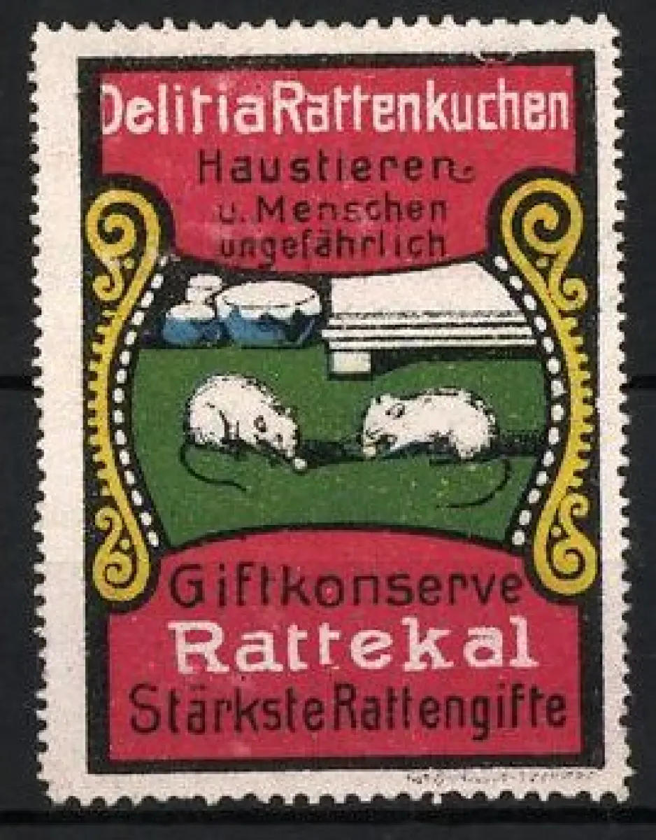 Reklamemarke Delitia Rattenkuchen, Rattengift, Giftkonserve Ratekal, Ratten essen das Gift