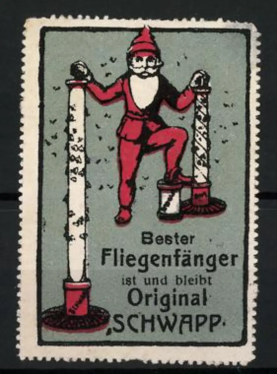 Reklamemarke Original Schwapp - Bester Fliegenfänger, Zwerg mit Fliegenfallen - Klebefallen