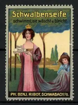 Reklamemarke Schwalbenseife schwimmt, sie wäscht und bleicht, Ph. Benj. Ribot, Schwabach, Königin mit Tablett