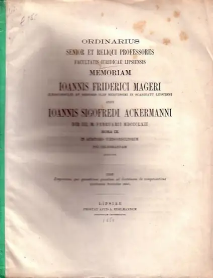 S.3-10 mit dt. Text eines Rechtsfalles betr. Schadenersatz durch Kompensation; latein. nur eine kurze Einleitung und einige Literaturbelege, sowie am Schluß Hinweis auf die Ehrung der Jurist. Fakultät der Universität Leipzig für J. Fr. Mager und J.S. Ackermann, angekündigt für den 3. Febr. 1862 durch C.G. Fr. Boerner und C.O. Schmidt.