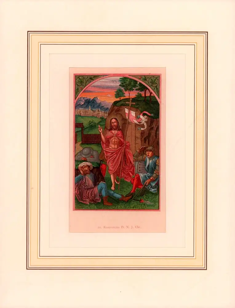 Auferstehung Jesus. - Nach dem handgemalten Unikat in einem aufwändigen polychromen Druckverfahren faksimiliert. - Papier leicht gebräunt u. mit winzigen Fleckchen im weißen Rand. Bild sauber in brillanten Farben. Hochwertig produzierte Wiedergabe vom Stock aus der Buchdruckpresse