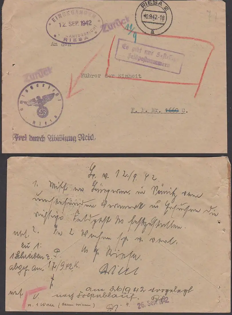 Riesa 10.9.42, Frei durch Ablösung Reich, zurück R2 "Es gibt nur 5-stellige Feldpostnummern", rs. Bearbeitungsvermerke