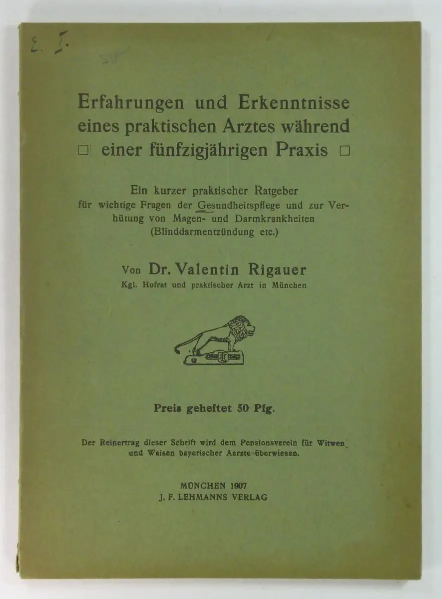 Rigauer, Valentin: Erfahrungen und Erkenntnisse eines praktischen Arztes während einer fünfzigjährigen Praxis. Ein kurzer praktischer Ratgeber für wichtige Fragen der Gesundheitspflege und zur Verhütung von Magen- und Darmkrankheiten (Blinddarmentzündung