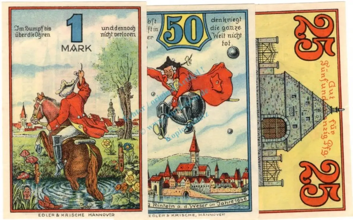 Rinteln , Notgeld Set mit 3 Scheinen unc-kfr. M-G 1125.1.b , Niedersachsen 1920 SeriennotgeldNotgeld : Münchhausen-Serie , 25, 50 Pfennig und 1 Mark , Signatur & KN