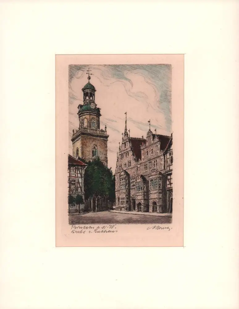 Rinteln a.d.W. Kirche u. Rathaus. Kolorierte Radierung