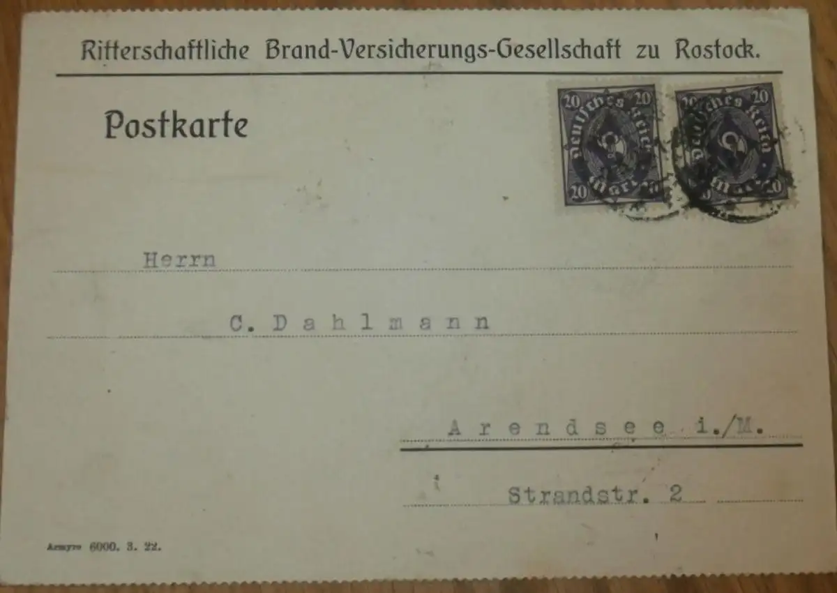 Ritterschaftliche Brand-Versicherung zu Rostock i. Mecklenburg , 1923 , C. Dahlmann in Arendsee i.M. , alte Karte !!!AZ-WR/1p