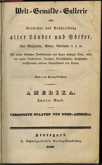 Titel: Welt-Gemälde-Gallerie oder Geschichte und Beschreibung aller Länder und Völker, ihrer Religionen, Sitten, Gebräuche u. s. w. Mit vielen bildlichen Darstellungen von Lagen wichtiger Orte, alten und neuen Denkmälern, Trachten, Geräthschaften, Kunstsachen, verschiedenen anderen Gegenständen und Karten. Aus dem Französischen. AMERIKA. Zweiter Band. Vereinigte Staaten von Nord-Amerika. [1] Vereinigte Staaten von Nord-Amerika von Roux de Rochelle. Deutsch von C. A. Mebold. [2] Die vereinigten Provinzen des Rio de la Plata von Cäsar Famin. Deutsch von C. A. Mebold