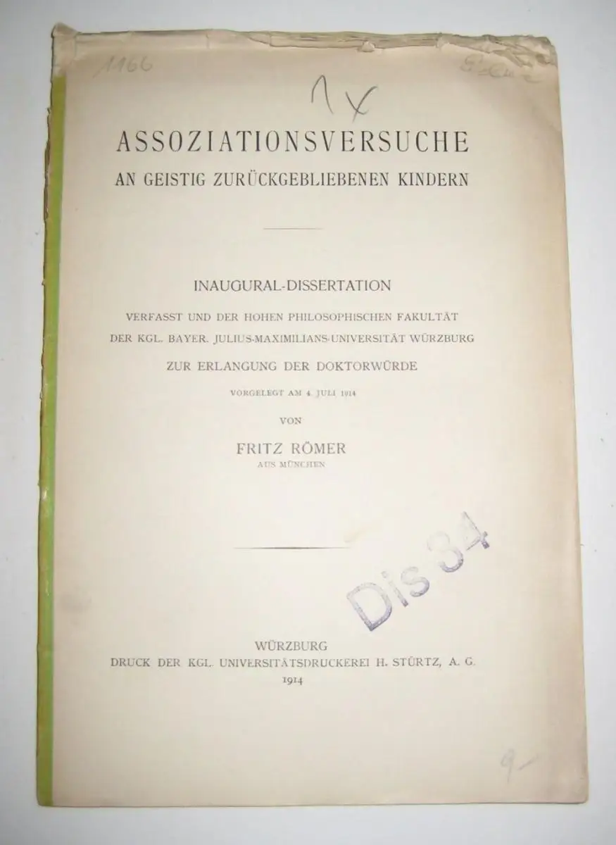Römer, Fritz: Assoziationsversuche an geistig zurückgebliebenen Kindern. Inaugural-Dissertation verfasst und der Hohen Philosophischen Fakultät der Kgl. Bayer. Julius-Maximilians-Universität Würzburg zur Erlangung der Doktorwürde, vorgelegt am 4. Juli 191