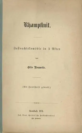 Roquette, Otto: Rhampsinit. Fastnachtskomödie in 3 Akten. Als Handschrift gedruckt.
