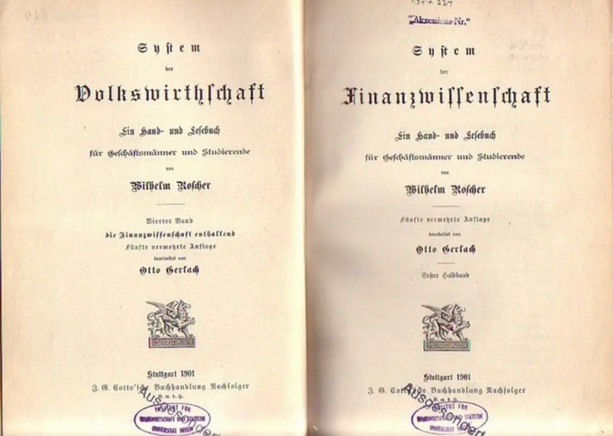 Roscher, Wilhelm - Heinrich Dade (Bearb.): 2 Bände: System der Finanzwissenschaft UND Nationalökonomik des Ackerbaues und der verwandten Urproduktionen (= System der Volkswirtschaft : Ein Hand- und Lesebuch für Geschäftsmänner und Studierende. Bde. 4 UND