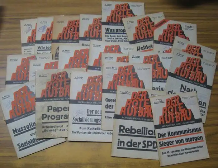 Titel: Der rote Aufbau. - Fast kompletter V. Jahrgang 1932, es fehlen nur die Hefte 21 (1. November), 23 und 24 (Dezember). - Halbmonatsschrift für Politik, Literatur, Wirtschaft, Sozialpolitik und Arbeiterbewegung. - Aus dem Inhalt: Hitlers 25 Programmpunkte / Wie lebt der Arbeiter in der Sowjetunion ? / Antwort an Trotzki / Zur Reichspräsidentenwahl / Weltkrieg droht / Ein unbekannter Brief von Fr. Engels über Literatur / Ist Sowjetdeutschland möglich ? / Frankreichs Kriegspläne / Versailles oder Moskau ? / Gespräch J. Stalin mit Emil Ludwig / Papens Programm.