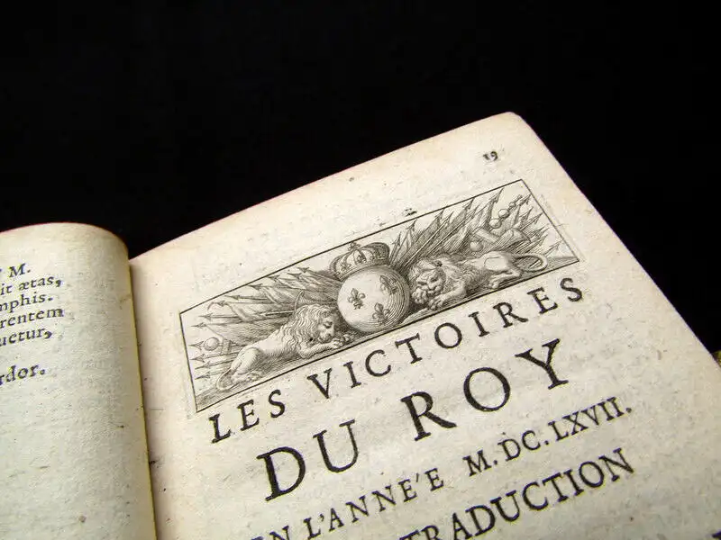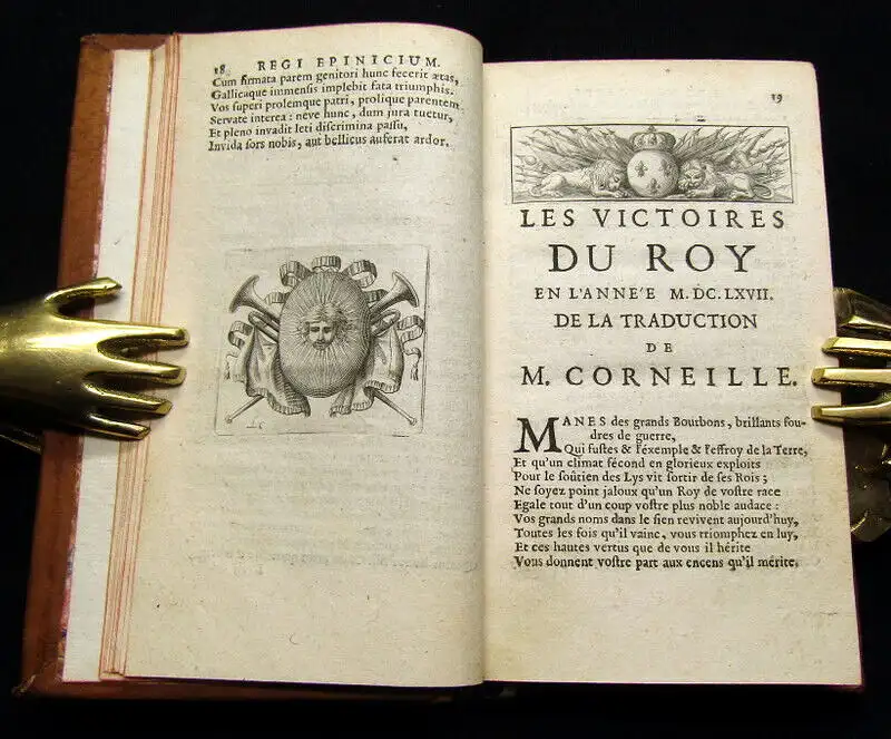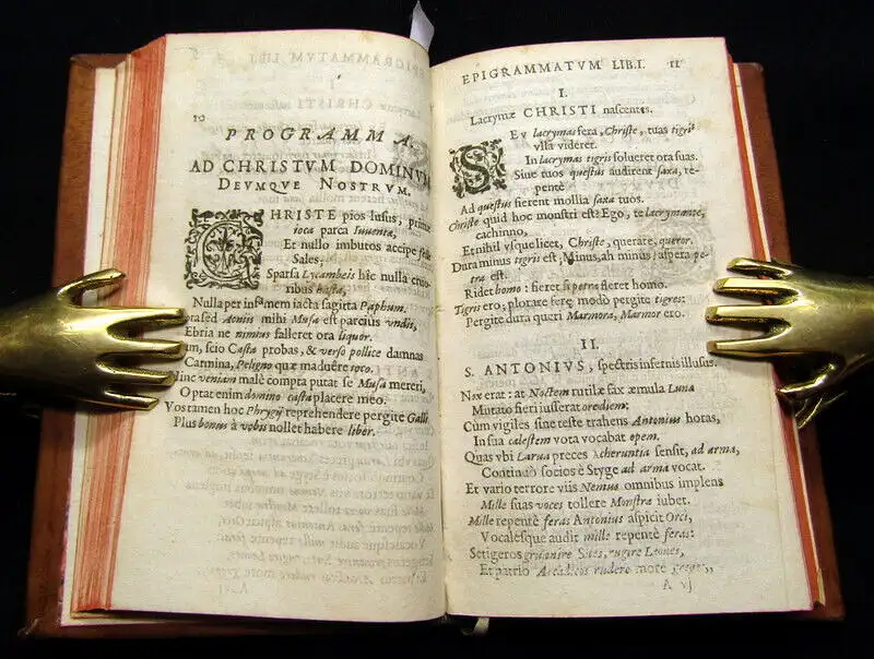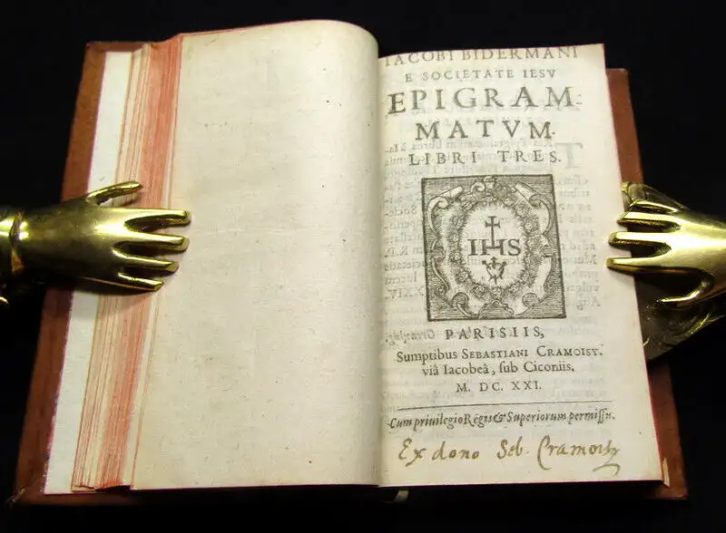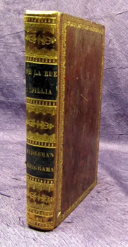 Einband berieben und bestoßen, prachtvolle, goldgeprägte Rückenverzierung, Deckel mit Goldprägung, roter Rundumschnitt, Vorsatz mit hs. Vermerken, 2. Titel mit hs. Notiz, Papier altersbedingt leicht gebräunt