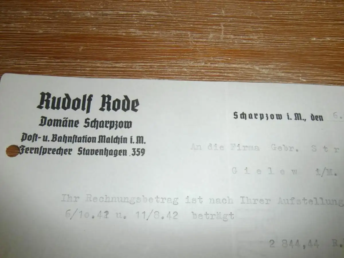 Rudolf Rode - Domäne Scharpzow i. Mecklenburg , 1942 , Stavenhagen , Malchin , altes Dokument !!!