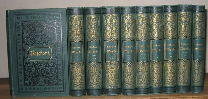 Freie Beschreibung: 18 x 11,8 cm. Grüne Original-Leinenbände mit floralen Einbandverzierungen in gold und schwarz; gemusterte Buchschnitte. Die Einbände sind leicht berieben. Band 1 mit Frontispiz Friedrich Rückert. Ca. 310 - 650 Seiten pro Band. Die Bände jeweils zu Beginn und Schluss leicht braunfleckig, die Innenteile nur sehr gelegentlich minimal fleckig (siehe auch weitere Abbildungen). Die Papiere in den Innengelenken teils schmal eingerissen, die Gelenke jedoch fest. Ganz guter Gesamtzustand