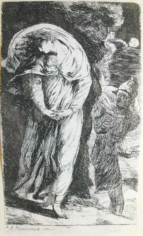 Vgl. Kat. Kunsthalle Hamburg, Ossian und die Kunst um 1800, Kat. 5 mit Abb. Variante zur Radierung nach dem Deckengemälde in Penicuik House. Fingal, den ein Sturm nach Uthorno, das Land seines Feindes Starno, verschlagen hat, befreit die Tochter des Königs Torcultorno ("Cathloda", 1. Gesang). - Runciman studiert zunächst Landschaftsmalerei an der Fronlis Academy in Glasgow. 1767 geht er auf Studienreise nach Rom, wo er besonders die Malerei der Antike, Michelangelos und der römischen Manieristen studiert und sich Füssli, Barry und Hamilton anschließt. Nach seiner Rückkehr erhält Runcimann den Auftrag, für seinen Mäzen, Sir James Clerk of Penicuik, Deckengemälde in seinem Wohnsitz auszuführen. - Linker Oberrand teilweise minimal beschnitten. An den Ecken lose montiert, untere linke Ecke mit minimaler Knickspur