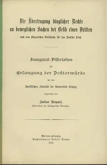 Ruppel, Julius: Die Übertragung dinglicher Rechte an beweglichen Sachen bei Besitz eines Dritten. Dissertation bei der Juristischen Fakultät der Universität Leipzig 1904.