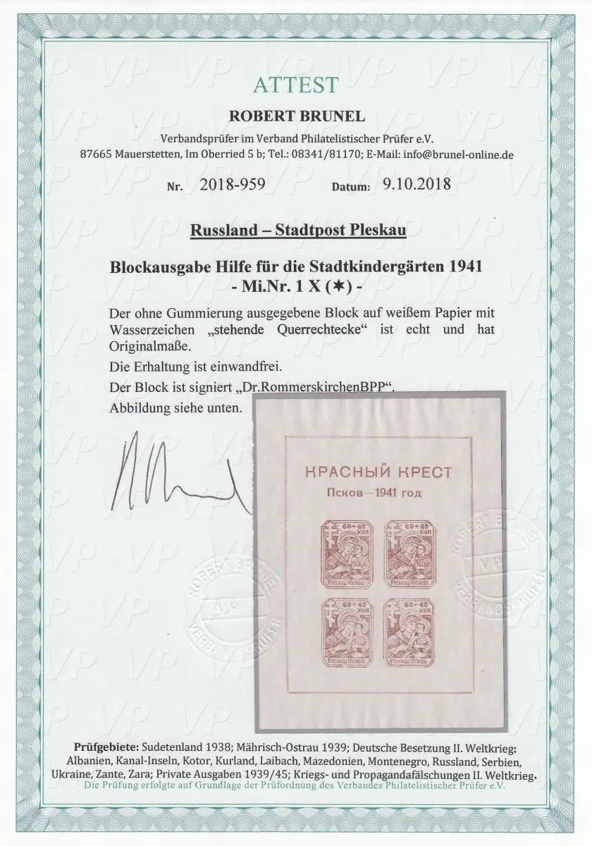 Russie Ville Post Pleskau MiNor Block 1 X, sans caoutchouc, signature BPP