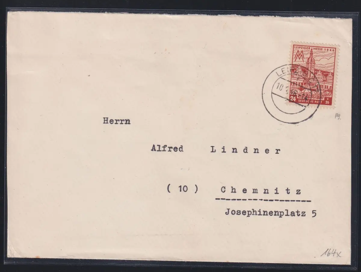 24 Pfennig Leipziger Messe als Einzelfrankatur auf Fernbrief portogerecht am 10.6.1946 von Leipzig nach Chemnitz gelaufen.