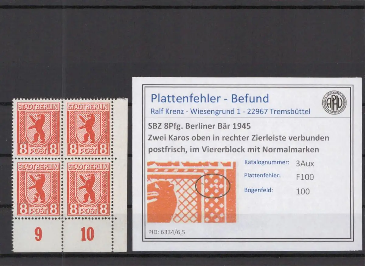 8Pfg. Berliner Baer, sauber postfrisch mit Plattenfehler gem. Plattenfehler Spezialkatalog