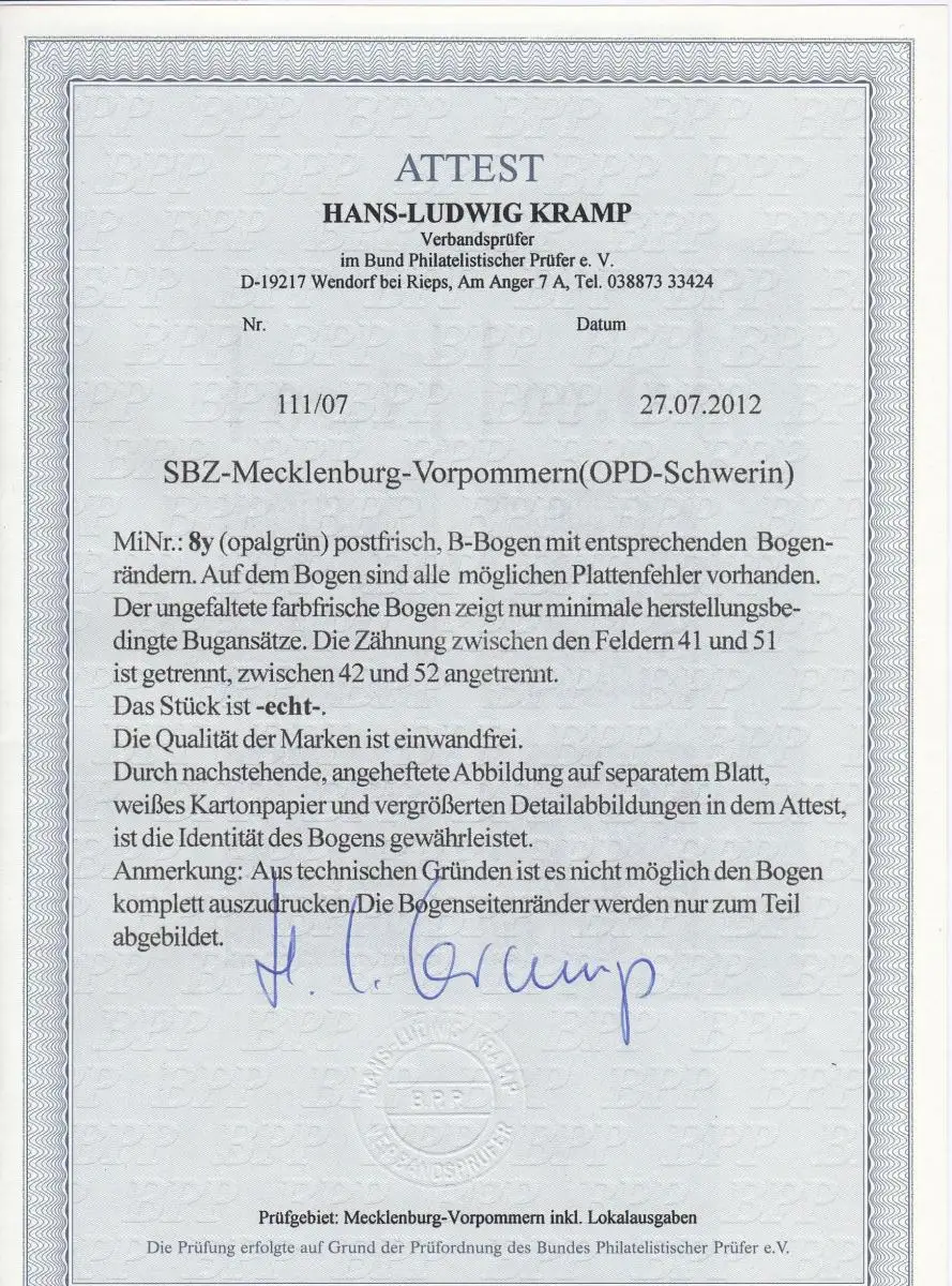 SBZ: Min. 8y, Bogen B, Eckrand, Postfreich, **, BPP Attest