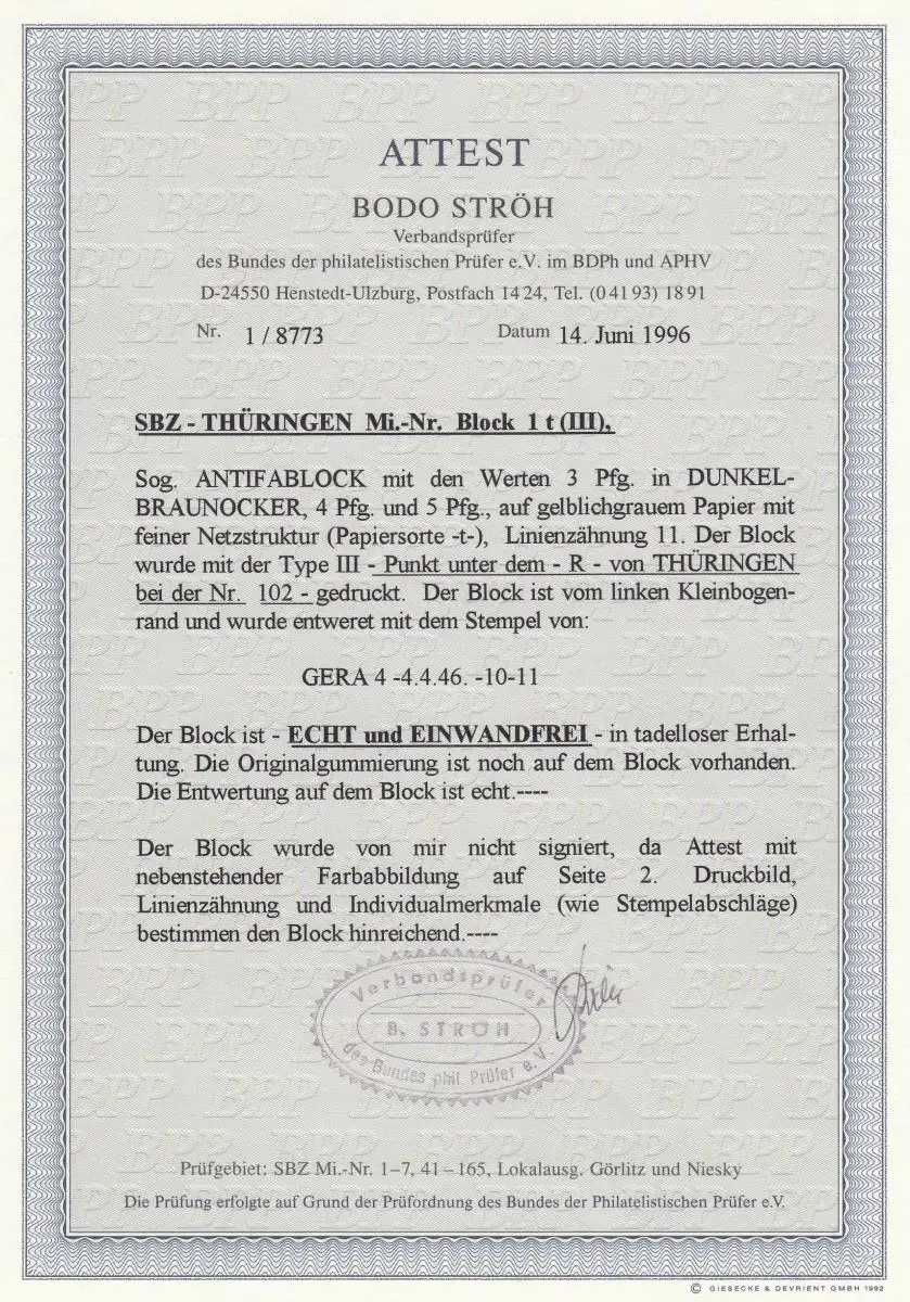 SBZ: Thüringen: Block Nr. 1 t(III), gestempelt, BPP Attest