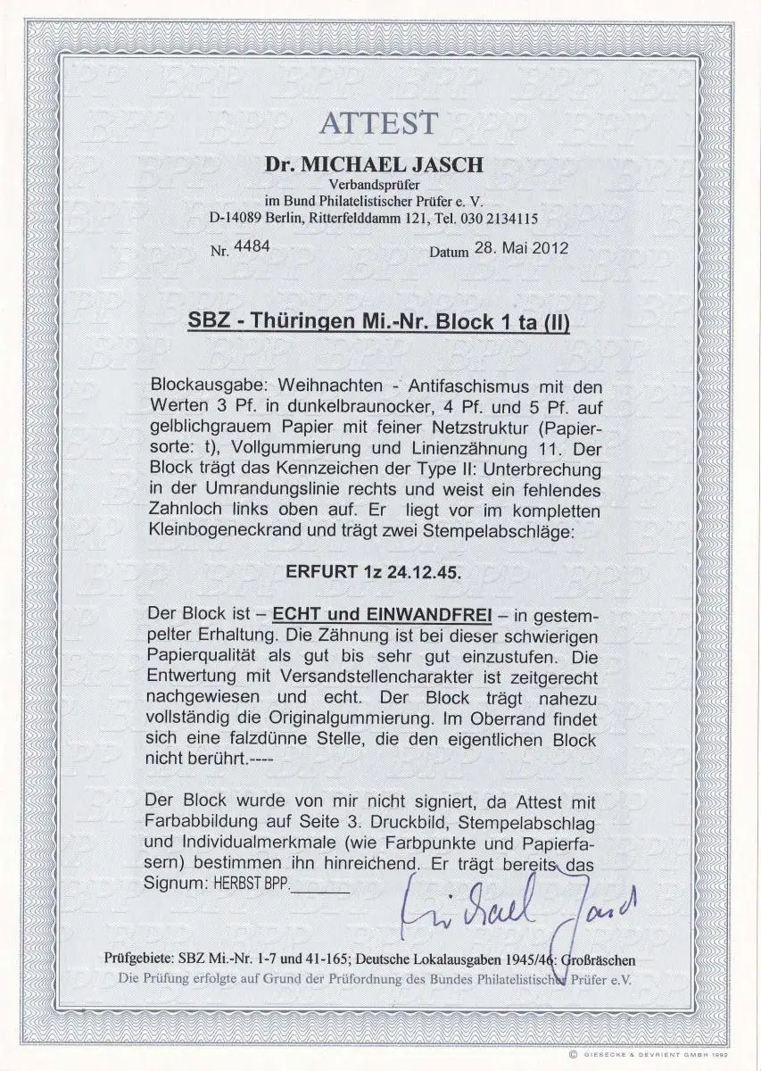 SBZ Thuringen Min. Block 1 ta (II), cacheté