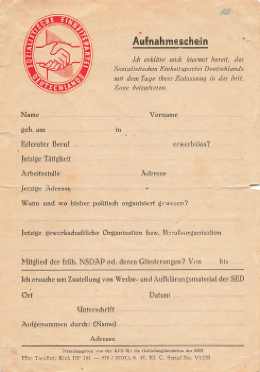 SED Aufnahmeschein britische Zone um 1946Herausgeber KPD für die Gründungskomitees der SED