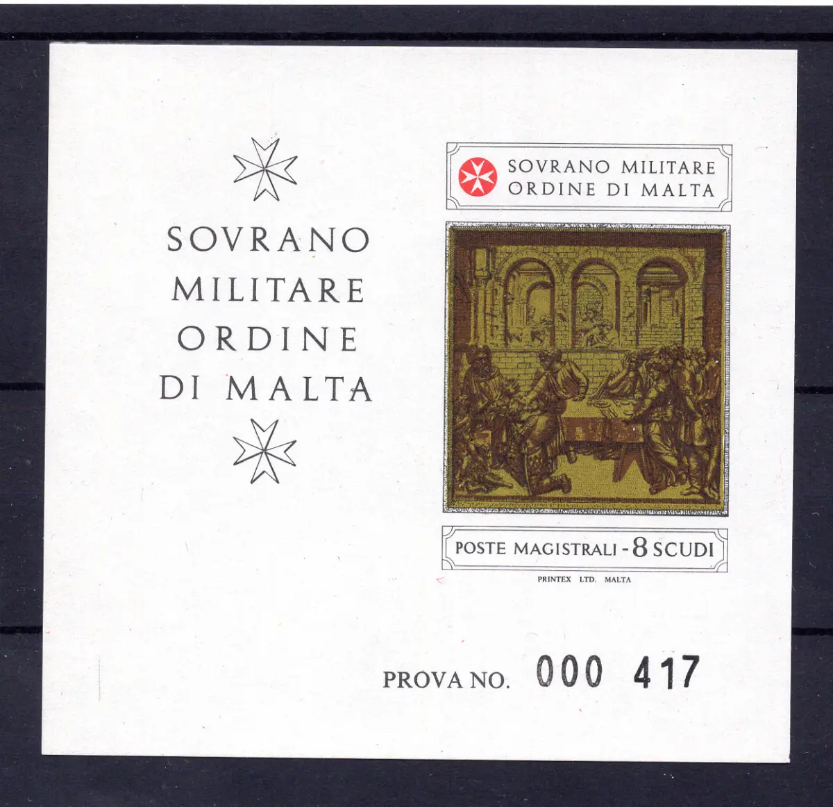 Ohne Gummi - SMOM - Formelle del Baptisterium 8 Schilde Nr. 209 Zettel Druckprobe weißes Papier ohne Wasserzeichen + die gleiche Briefmarke im gezackten Zettel mit Proofstempel - Schönes Set Cod.1850/WEB