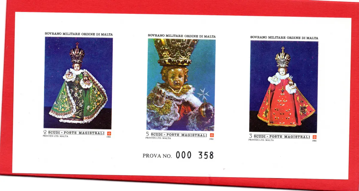 Ohne Gummi - SMOM - Weihnachten '86 Prager Jesuskind Nr. 257/259, Druckprobebogen, weißes Papier, ohne Wasserzeichen Cod.1866/WEB