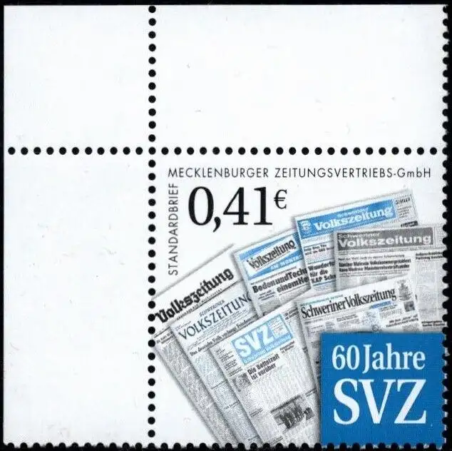 • MichSeite SVZ: MiNr. 5, 01.07.2005, "60 Jahre SVZ", Satz, Eckrand, postfrisch Beschreibung \nPostdienstleister: Schweriner Volkszeitung, Schwerin \nAusgabeanlass: Briefmarkenausgabe "60 Jahre SVZ" Katalognummer: MiNr. 5 Ausgabedatum: 01.07.2005 Nominale: Satz (1 Wert) zu 0,41 EUR \nTyp: - \nErhaltung: nassklebend, gezähnt, postfrisch \nHinweis: Eckrandstück oben links