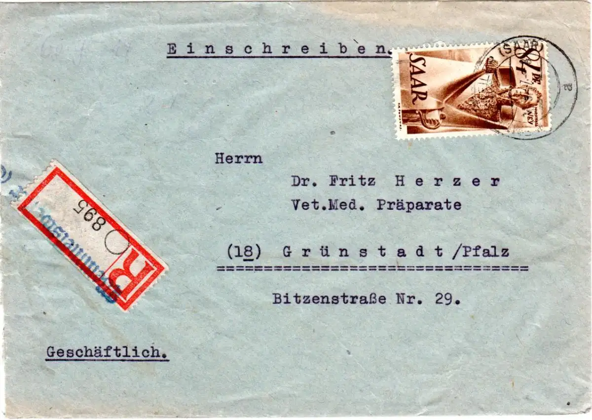 Saar 1947, 84 Pf. auf Einschreiben Brief v. Wemmetsweiler n. Grünstadt